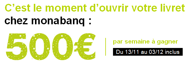 A partir d’aujourd’hui et jusqu’au 3 décembre inclus, les clients Monabanq peuvent participer au jeu Épargne avec tirage au sort pour gagner 500€ qui seront placés sur le Livret A ou le Livret de développement durable et solidaire ouvert pendant la campagne. Cette campagne dure 3 semaines avec 1 tirage au sort par semaine parmi les ouvertures LVA et LDDS de la semaine précédente. Il y aura 1 gagnant par semaine avec une dotation de 500€.