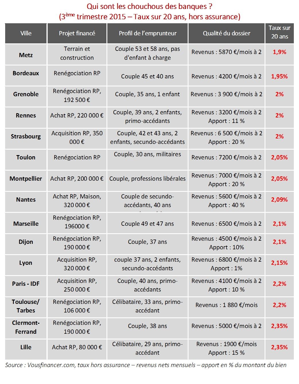 Les « Chouchous des banques », les meilleurs profils pour les banques, subissent également la remontée des taux. La hausse des taux de crédit immobilier concerne également les meilleurs profils qui empruntent au mieux à 1,90 % sur 20 ans à Metz, ou 1,95 % à Bordeaux, contre 1,64 % à Grenoble ou à Lyon dans notre précédent baromètre, en mai. « Depuis le mois de mai, les taux de crédit ont augmenté de 0,30 point, soit un retour à leur niveau de début 2015. Toutefois, alors qu’en moyenne on emprunte actuellement à 2,65 % sur 20 ans, certains emprunteurs bénéficient de décotes liées à leur profil leur permettant d’emprunter à des taux proches de 2 %. Ce sont eux que nous appelons ‘les chouchous des banques’ : essentiellement des couples avec des revenus supérieurs à 4000 € nets par mois à deux et au moins 10 % d’apport » constate Sandrine Allonier, responsable des relations banques de Vousfinancer.com.