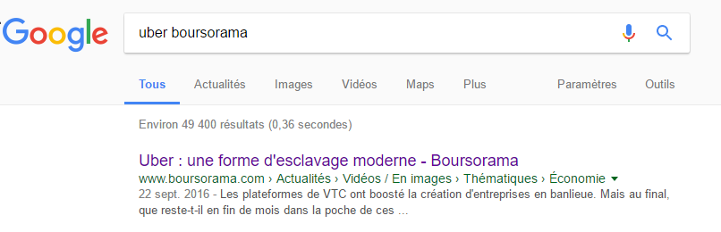 Un partenariat pour le moins surprenant, alors que Google associe par défaut Uber à l’escalavagiste moderne, une page associée à une actualité publiée sur le site même de [a[Boursorama]a].